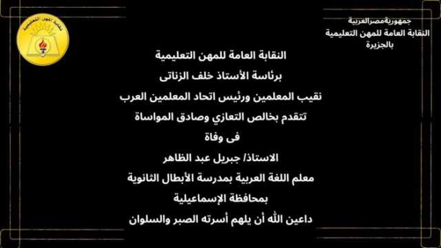 تلقت غرفة عمليات النقابة العامة للمهن التعليمية برئاسة خلف الزناتي، نقيب المعلمين ورئيس اتحاد المعلمين العرب، إخطارًا من النقابة الفرعية للمعلمين بالإسماعيلية، يفيد وفاة جبريل عبد الظاهر معلم لغة عربية بمدرسة الأبطال الثانوية التابعة لقرية الأبطال شرق البحيرات، أمس الاثنين، أثناء اليوم الدراسي، إثر أزمة قلبية مفاجئة.