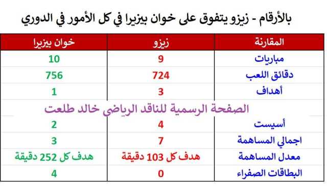 أرقام زيزووكتب خالد طلعت، عبر صفحته على موقع التواصل الاجتماعي فيسبوك: "فيه زملكاوية كتير بيقولوا إن زيزو مقدمش أي حاجة للأهلي ، وفي نفس الوقت شايفين إن خوان بيزيرا أسطورة وعامل أداء عالمي مع الزمالك، بس الأرقام بتقول غير كده خااااااااااااالص".