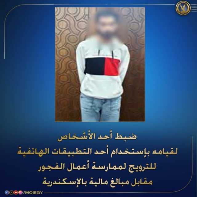 تمكنت الأجهزة الأمنية بوزارة الداخلية، من ضبط أحد الأشخاص لقيامه باستخدام أحد التطبيقات الهاتفية للترويج لممارسة أعمال الفجور مقابل مبالغ مالية بالإسكندرية، وذلك في إطار جهود مكافحة الجرائم المنافية للآداب العامة.