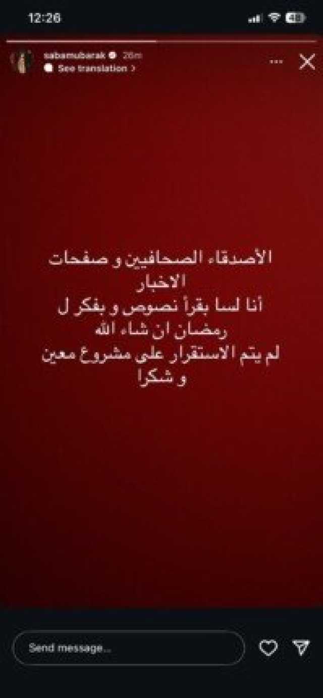 وقالت صبا مبارك، عبر حسابها الرسمي بموقع تداول الصور والفيديوهات «إنستجرام»، عن مصير مشاركتها: «الأصدقاء الصحفيين وصفحات الأخبار، أنا لسه بقرأ نصوص وبفكر لرمضان إن شاء الله، لم يتم الاستقرار على مشروع معين، وشكرًا».