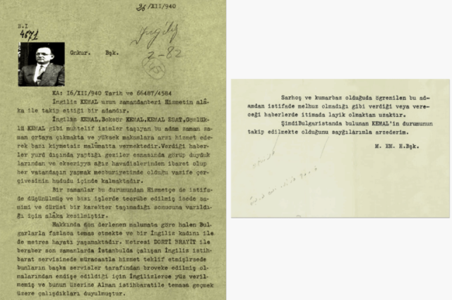 إعلانولا تقتصر الوثيقة على تقييمه المهني فقط، بل تتوسع في عرض ملامح من حياته الخاصة وعلاقاته الخارجية، إذ تظهر أنه كان على صلة قوية بدوائر بلغارية خلال أواخر الثلاثينيات، وكان يقيم في إسطنبول مع صديقته البريطانية دورثي برايت في علاقة وُصفت بأنها "معيشة مشتركة".