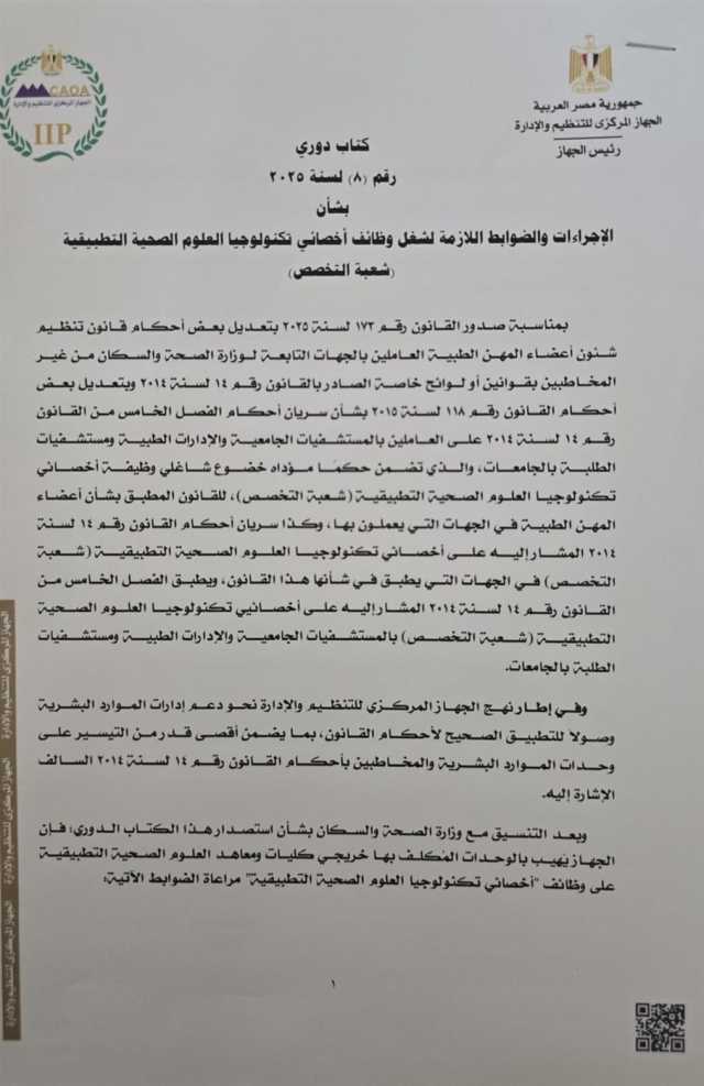 رحبت النقابة العامة للعلوم الصحية بالكتاب الدوري رقم (8) لسنة 2025 الصادر عن الجهاز المركزي للتنظيم والإدارة، بشأن الإجراءات والضوابط المنظمة لشغل وظائف أخصائي تكنولوجيا العلوم الصحية التطبيقية (شعبة التخصص)، مؤكدة أنه يمثل نقطة تحول تاريخية نحو الاعتراف الكامل بدور خريجي كليات ومعاهد العلوم الصحية التطبيقية، ودمجهم رسميًا ضمن منظومة المهن الطبية في مصر.