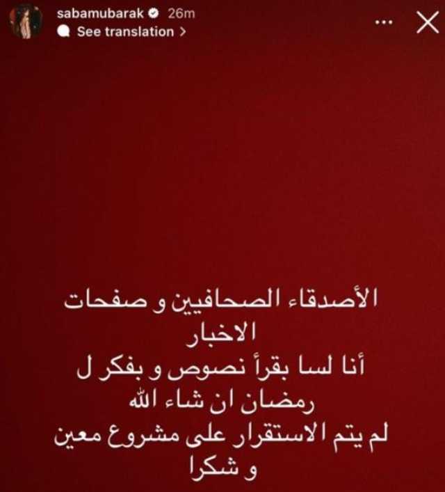 كشفت الفنانة صبا مبارك، عبر حسابها الرسمي بموقع تبادل الصور والفيديوهات "إنستجرام"، عن موقفها من المشاركة في سباق دراما رمضان 2026، مؤكدة أنها لم تتخذ قرارها بعد بشأن أي عمل جديد، وكتبت: "الأصدقاء الصحفيين وصفحات الأخبار، أنا لسه بقرأ نصوص وبفكر لرمضان إن شاء الله ولم يتم الاستقرار على مشروع معين، وشكرًا".