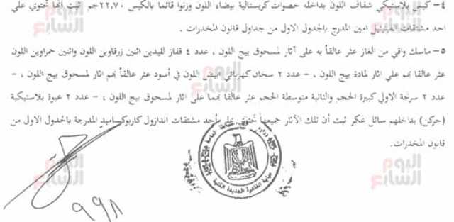 وعلى هذا يواصل "اليوم السابع" نشر تفاصيل تحقيقات النيابة العامة في القضية مع المتهمين فى قضية "المخدرات الكبري"، خاصة تقرير المعمل الكميائى: