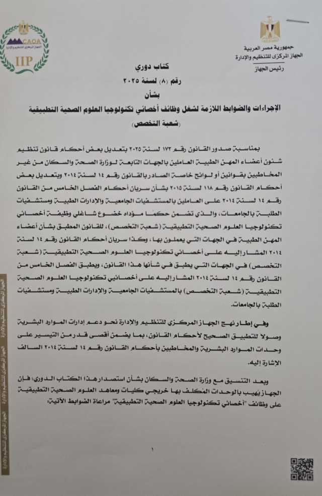 رحبت النقابة العامة للعلوم الصحية، بالكتاب الدوري رقم 8 لسنة 2025، الصادر عن الجهاز المركزي للتنظيم والإدارة، بشأن الإجراءات والضوابط اللازمة لشغل وظائف أخصائي تكنولوجيا العلوم الصحية التطبيقية "شعبة التخصص"، والذي يُعد خطوة مفصلية نحو الاعتراف الكامل بدور خريجي كليات ومعاهد العلوم الصحية التطبيقية، ودمجهم رسميًا ضمن منظومة المهن الطبية في مصر.