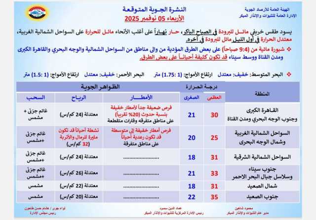 وعن الظواهر الجوية تتكون شبورة مائية صباحا على شمال البلاد حتى القاهرة الكبرى وشمال الصعيد ووسط سيناء ومدن القناة؛ قد تكون كثيفة أحيانا على بعض الطرق، مع فرص لسقوط أمطار متوسطة ورعدية أحيانا على مناطق من شمال الصعيد والصحراء الغربية على فترات متقطعة.