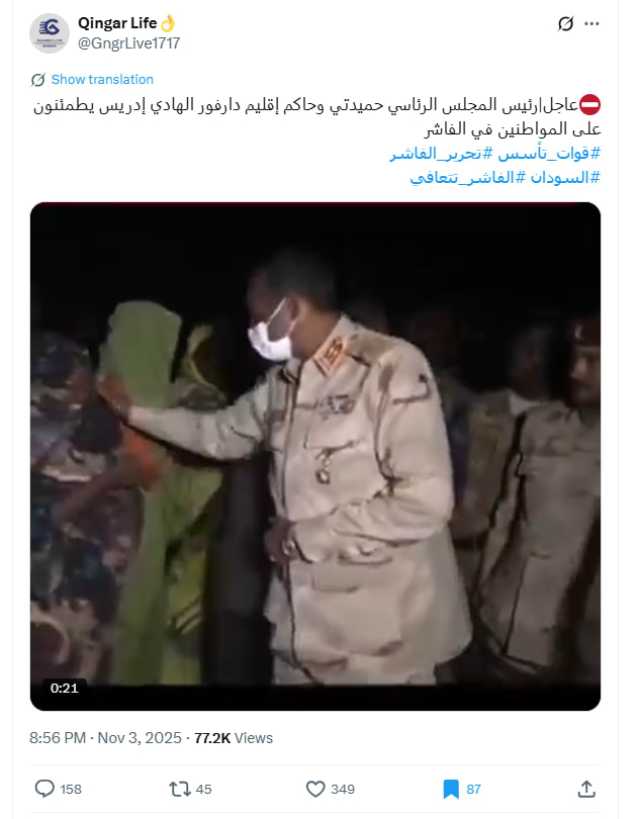 تداول فيديو لـزيارة حميدتي للفاشر بعد سيطرة الدعم السريع على المدينة.. هذه حقيقته