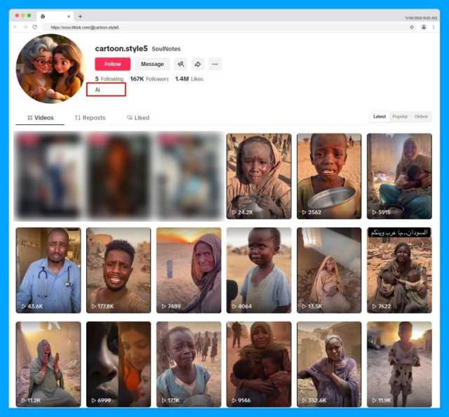 وتوصل فريقنا إلى المصادر الأصلية لهذه المقاطع، فتبين أن مجموعة من الحسابات على منصة "تيك توك" خصصت محتواها خلال الأسابيع الأخيرة لإنتاج مقاطع مولدة بالكامل بالذكاء الاصطناعي، تتناول الأوضاع الإنسانية في السودان، دون أن تُظهر أشخاصا حقيقيين كما زعم ناشروها.
