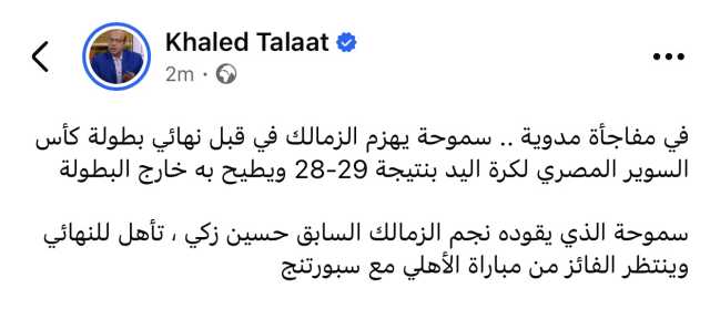 وكتب خالد طلعت في منشوره: “في مفاجأة مدوية .. سموحة يهزم الزمالك في قبل نهائي بطولة كأس السوبر المصري لكرة اليد بنتيجة 29-28 ويطيح به خارج البطولة".
