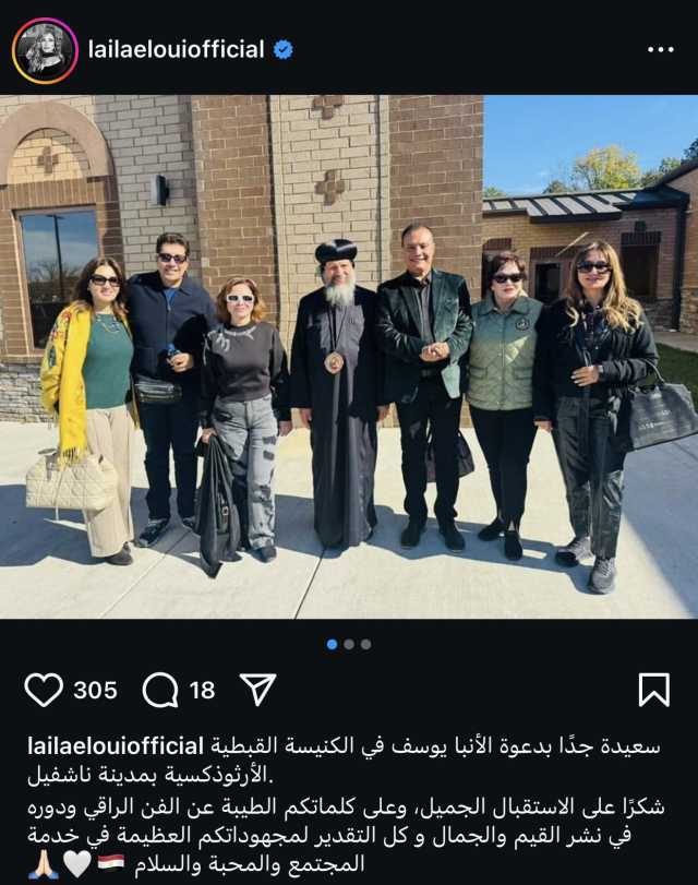 ونشرت ليلى علوي عبر حسابها الرسمي بموقع إنستجرام صور من الزيارة وعلقت عليها قائلة: “سعيدة جدًا بدعوة الأنبا يوسف في الكنيسة القبطية الأرثوذكسية بمدينة ناشفيل، شكرًا على الاستقبال الجميل، وعلى كلماتكم الطيبة عن الفن الراقي ودوره في نشر القيم والجمال، وكل التقدير لمجهوداتكم العظيمة في خدمة المجتمع والمحبة والسلام".