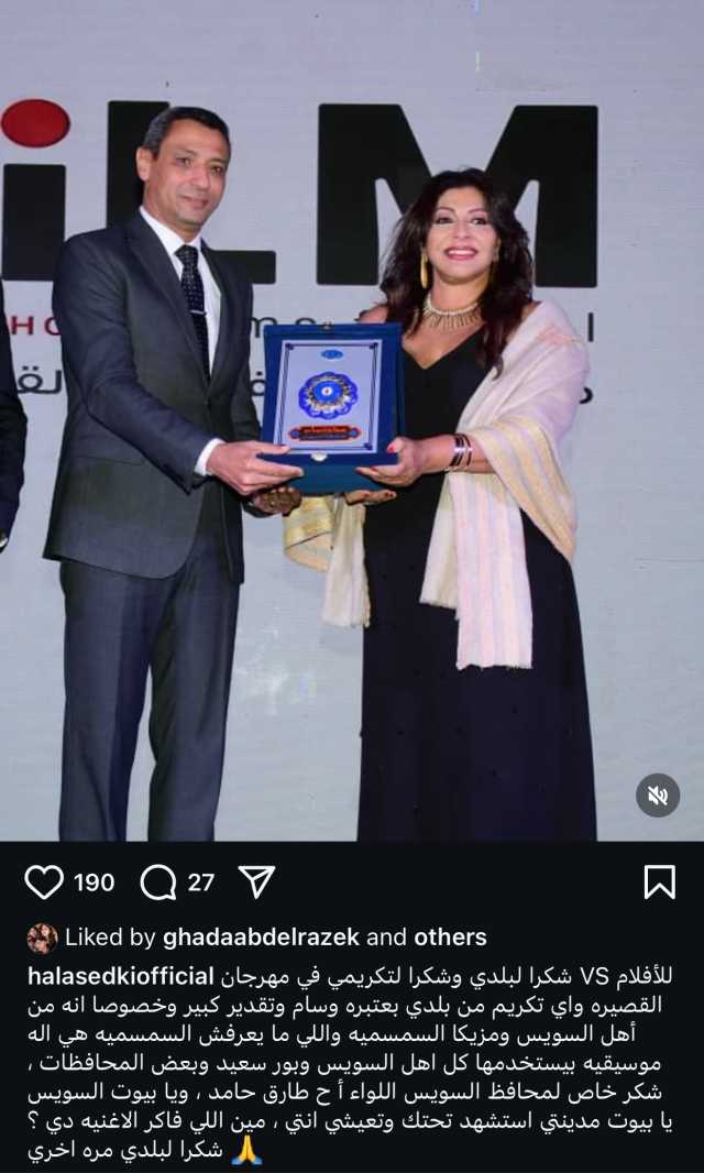 ونشرت هالة صدقي عبر حسابها الرسمي بموقع إنستجرام صور من التكريم وعلقت عليها قائلة: “شكرًا لبلدي وشكرًا لتكريمي في مهرجان VS للأفلام القصيرة، وأي تكريم من بلدي بعتبره وسام وتقدير كبير، وخصوصًا إنه من أهل السويس ومزيكا السمسميه".