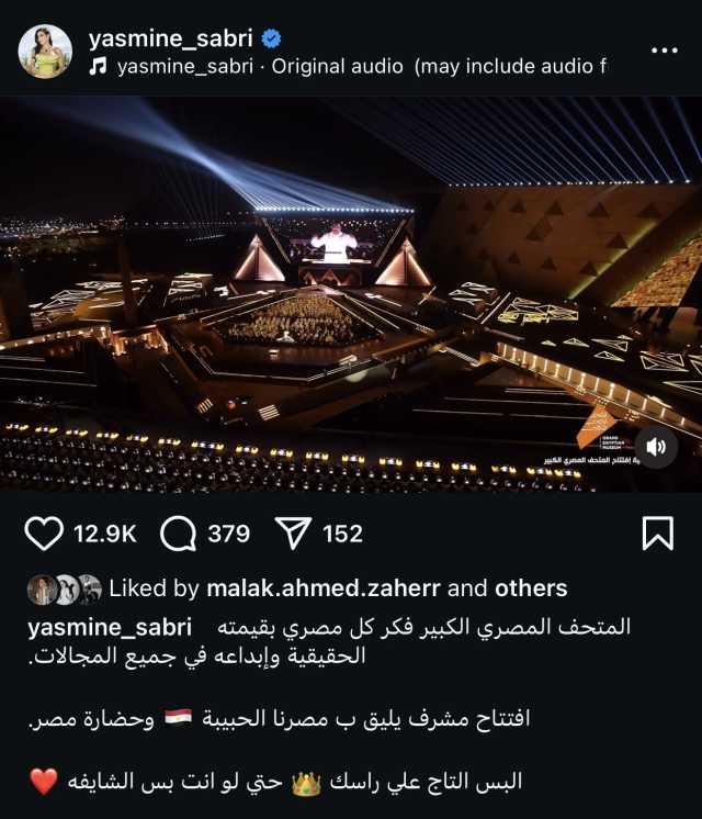 عبرت الفنانة ياسمين صبري عن سعادتها وفخرها بحفل أفتتاح المتحف المصري الكبير عبر حسابها الشخصي بموقع التواصل الإجتماعي إنستجرام.