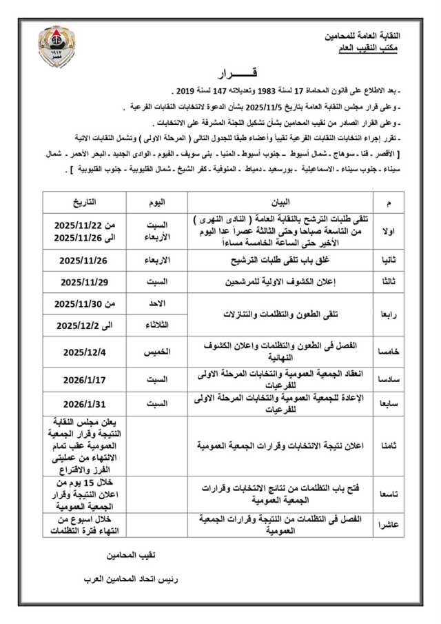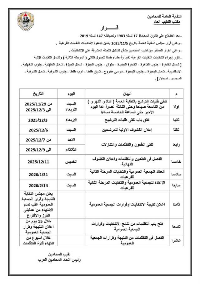 أعلنت النقابة العامة للمحامين، أنه بعد الاطلاع على قانون المحاماة رقم 17 لسنة 1983 وتعديلاته بالقانون رقم 147 لسنة 2019، وعلى قرار مجلس النقابة العامة الصادر في 5 نوفمبر 2025 بشأن الدعوة لانتخابات النقابات الفرعية، وكذلك القرار الصادر من نقيب المحامين بتشكيل اللجنة المشرفة على الانتخابات.