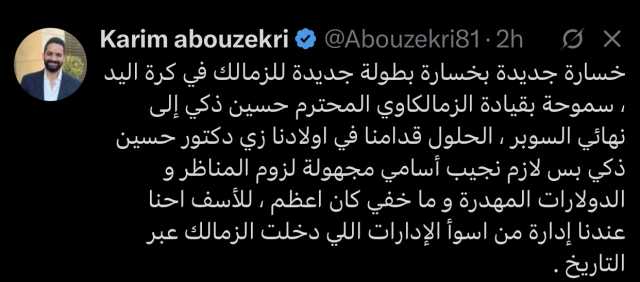 وكتب أبو ذكرى عبر حسابه الشخصي على موقع التواصل الاجتماعي إكس “تويتر سابقًا”: “خسارة جديدة بخسارة بطولة جديدة للزمالك في كرة اليد، سموحة بقيادة الزمالكاوي المحترم حسين ذكي إلى نهائي السوبر، الحلول قدامنا في أولادنا زي دكتور حسين ذكي، بس لازم نجيب أسامي مجهولة لزوم المناظر والدولارات المهدرة، وما خفي كان أعظم، للأسف احنا عندنا إدارة من أسوأ الإدارات اللي دخلت الزمالك عبر التاريخ".