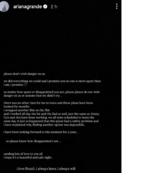 تعبير صادق عن الأسف والامتنانفي رسالة مليئة بالمشاعر، عبّرت أريانا عن أسفها العميق لجمهورها في البرازيل، مؤكدة أن هذا الحدث كان من أكثر اللحظات التي تطلعت إليها طوال العام.