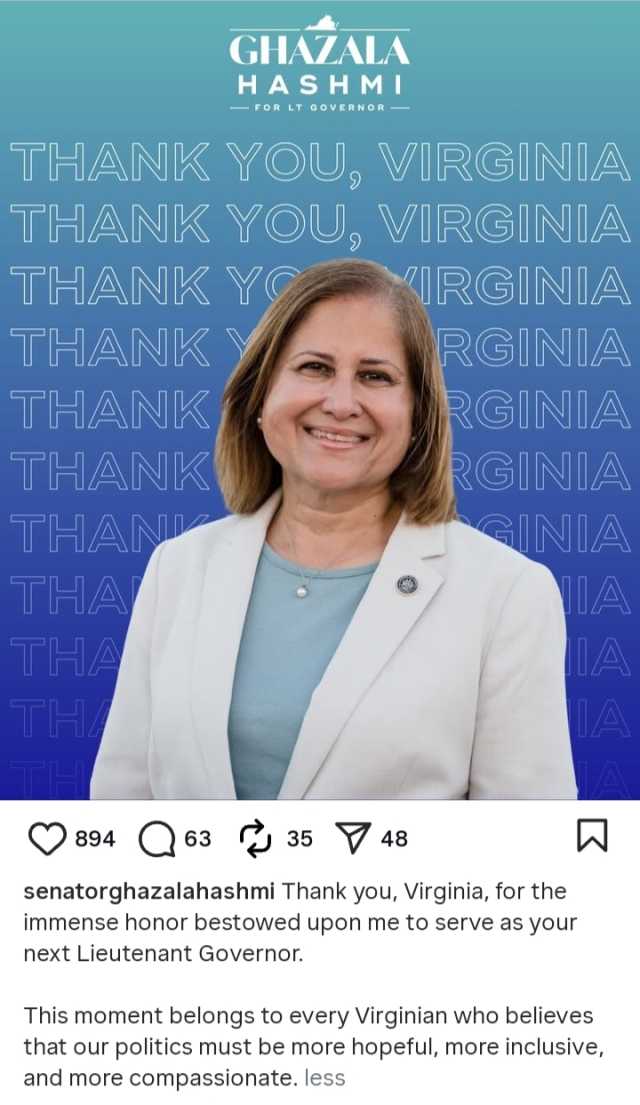 و قالت هاشمي: " شكرًا لكِ، فيرجينيا، على الشرف العظيم الذي منحتموني إياه لخدمة الولاية كنائبة الحاكم القادمة.
