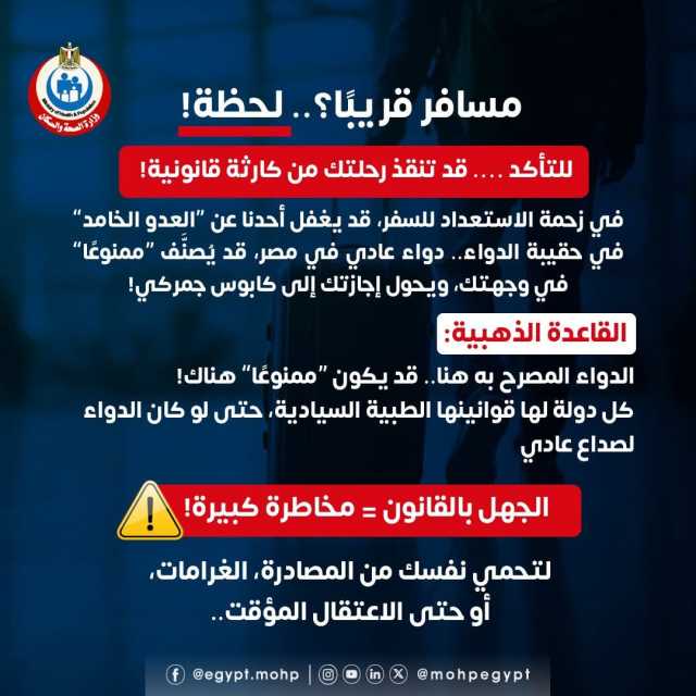 وقالت وزارة الصحة والسكان، إن الدواء المصرح به في مصر قد يكون ممنوعًا في البلد التي تسافر لها.. اتبع هذه الخطوات قبل إغلاق حقيبتك.