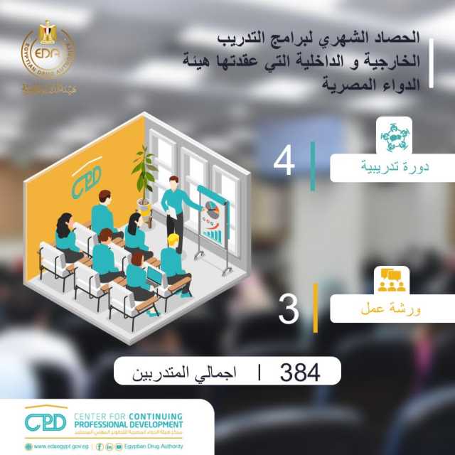 في إطار سعيها الدائم للارتقاء بالمستوى المهني والعملي للعاملين في القطاع الدوائي، أعلنت هيئة الدواء المصرية عن انتهاء عدد من البرامج التدريبية وورش العمل المتخصصة التي نظمها مركز التطوير المهني المستمر خلال الشهر الماضي، بمشاركة 327 متدربًا من مختلف الجهات المعنية بالمنظومة الدوائية.