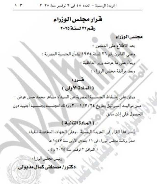 أصدر الدكتور مصطفى مدبولي، رئيس الوزراء، قرار بإسقاط الجنسية عن ساهر محمد حسن عوض، من مواليد إسرائيل بتاريخ 4 يوليو 2001، وذلك لتجنسه بجنسية أجنبية دون إذن سابق.