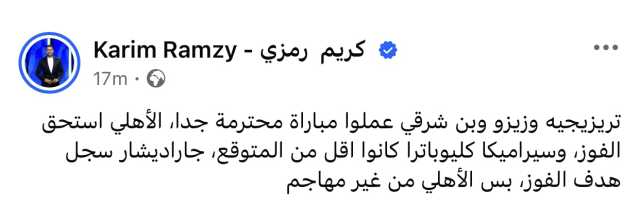 وقال رمزي في منشور عبر حسابه على موقع التواصل الاجتماعي فيسبوك: “تريزيجيه وزيزو وبن شرقي عملوا مباراة محترمة جدًا، الأهلي استحق الفوز، وسيراميكا كليوباترا كانوا أقل من المتوقع، جاراديشار سجل هدف الفوز، بس الأهلي من غير مهاجم".