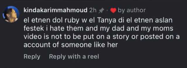 وكتبت كندة كريم محمود عبد العزيز تعليقا على أحد المنشورات التى تزعم بوجود علاقة حب تجمع والدها بالفنانة دينا الشربيني، قائلة: الاثنين دول روبي والتانية دي فستك أنا بكرههم وفيديو بابا وماما مينفعش تتجاب سيرتهم فى استوريهات او على اكونت حد زيهم".