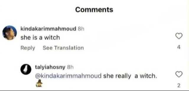 وفي منشور آخر، هاجمت كندة كريم محمود عبد العزيز هي وابنة تامر حسني، وكتبتا: “إنها ساحرة"، لترد تاليا تامر حسني معلقة “هى حقيقي ساحرة”.
