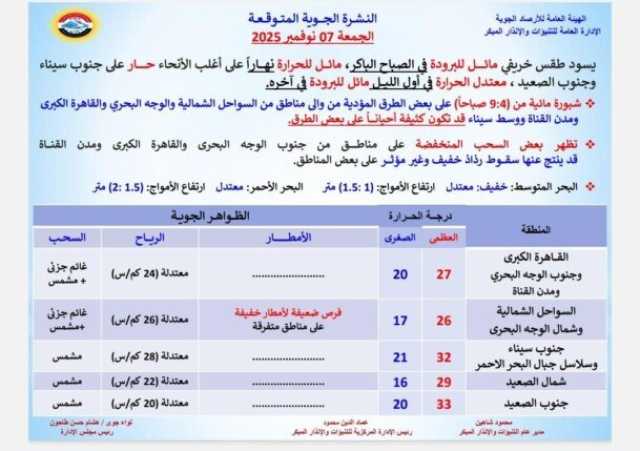 كشفتِ الهيئة العامة للأرصاد الجوية عن حالة الطقس اليوم الجمعة 7 نوفمبر 2025، موضحةً الظواهر الجوية ودرجات الحرارة المتوقعة في محافظات ومدن مصر.