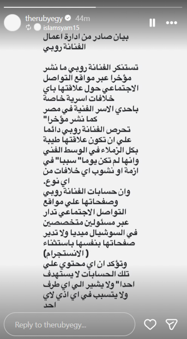 واختُتم البيان بقوله: “تؤكد روبي أن الحسابات الرسمية على مواقع التواصل الاجتماعي تُدار بواسطة فريق مختص من مسؤولي السوشيال ميديا (باستثناء إنستجرام)، وليست تحت إدارتها الشخصية"، مشيرًا إلى أن أي محتوى يُنشر على تلك الحسابات لا يستهدف أي طرف، ولا يُقصد به التلميح أو الإيذاء لأي شخص”.