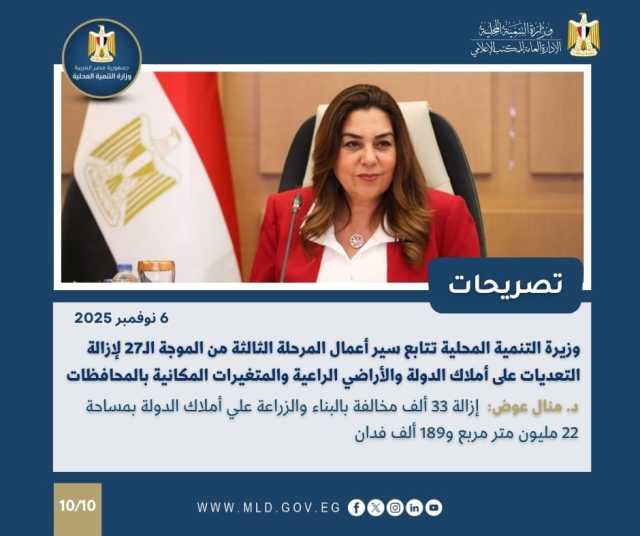 تابعت الدكتورة منال عوض وزيرة التنمية المحلية والقائم بأعمال وزير البيئة ، سير أعمال المرحلة الثالثة من الموجة الـ27 لإزالة التعديات على أراضي أملاك الدولة والمتغيرات المكانية الغير قانونية والتعديات على الأراضى الزراعية بجميع المحافظات والتي تم تمديدها حتى نهاية نوفمبر 2025 ، حيث قامت الأجهزة التنفيذية للوحدات المحلية بالمحافظات بالتعاون مع قوات إنفاذ القانون والجهات المعنية بإزالة عدد 32980 مخالفة تتضمن إزالة عدد 15061 مخالفة للتعدى على أراضى الدولة منها 8018 حالة تعدى بالبناء على مساحة 22 مليون م٢ وعدد 7043 حالة تعدى بالزراعة على مساحة 189.5 ألف فدان.