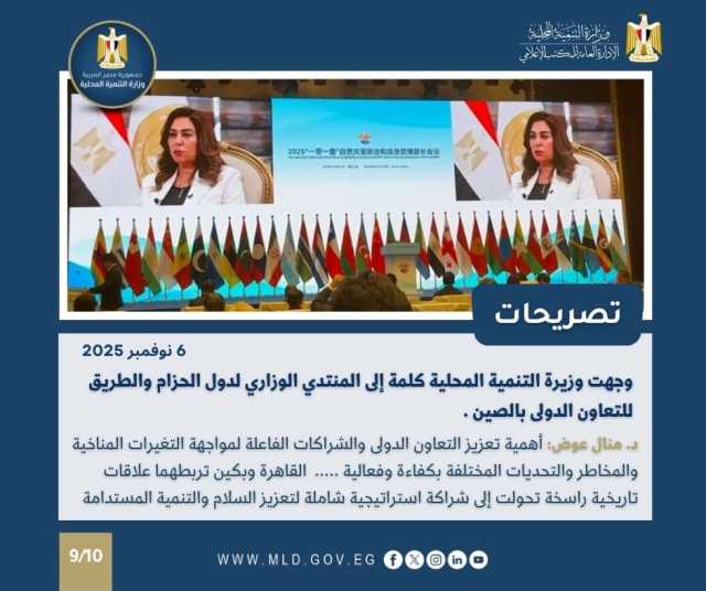 أكدت الدكتورة منال عوض وزيرة التنمية المحلية والقائم بأعمال وزير البيئة ، على أهمية تعزيز التعاون الدولى والشراكات الفاعلة والإرادة السياسية المشتركة لمواجهة التغيرات المناخية والكوارث الطبيعية والمخاطر والتحديات المختلفة بفعالية وكفاءة ، جاء ذلك فى الكلمة التى وجهتها وزيرة التنمية المحلية إلى الجلسة الوزارية للمنتدي الوزاري لدول الحزام والطريق للتعاون الدولى فى الحد من مخاطر الكوارث وإدارة الطوارئ لعام 2025 والمنعقد خلال الفترة من 5-7 نوفمبر الجاري فى جمهورية الصين بحضور وانج شيانج شي وزير إدارة الطوارئ الصيني وعدد من الوزراء والمسؤولين من مختلف دول العالم .