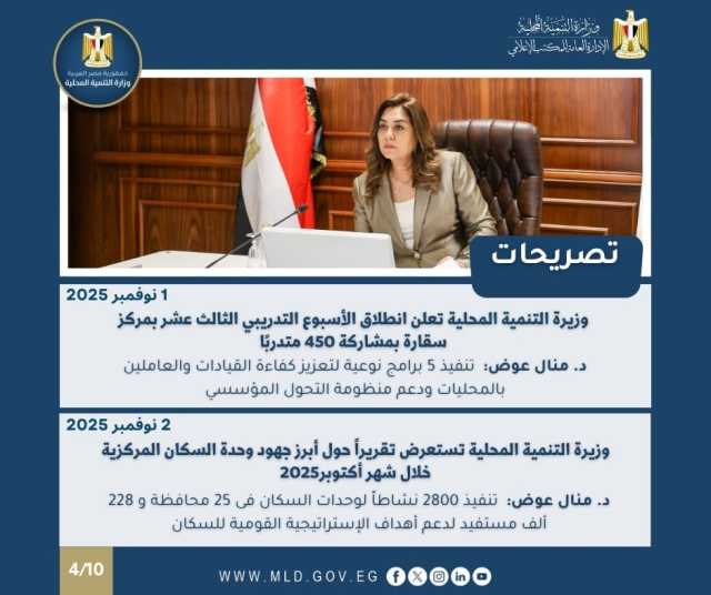 كما أعلنت الدكتورة منال عوض، وزيرة التنمية المحلية ، عن إنطلاق فعاليات الأسبوع التدريبي الثالث عشر من الخطة التدريبية السنوية لمركز التنمية المحلية بسقارة للعام 2025 / 2026، والمقرره خلال الفترة من 2 حتى 5 نوفمبر 2025، بتنفيذ 5 برامج تدريبية يستفيد منها 450 متدربًا من مختلف المحافظات، ضمن جهود الوزارة لبناء قدرات العاملين بالإدارة المحلية ورفع كفاءة الأداء في مختلف القطاعات الخدمية والتنموية.