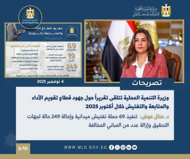 تلقت الدكتورة منال عوض وزيرة التنمية المحلية والقائم بأعمال وزير البيئة، تقريراً من قطاع تقويم الأداء والمتابعة والتفتيش بالوزارة برئاسة المهندس هيثم الدسوقي ، حول أبرز مجهودات القطاع خلال شهر أكتوبر 2025 في متابعة الأداء الميداني للوحدات المحلية بالمحافظات، وضبط منظومة العمل وتحسين الخدمات المقدمة للمواطنين، حيث تم تنفيذ 69 حملة تفتيش ميدانية في 10 محافظات وإحالة 249 حالة لجهات التحقيق وإزالة عدد من المباني المخالفة .
