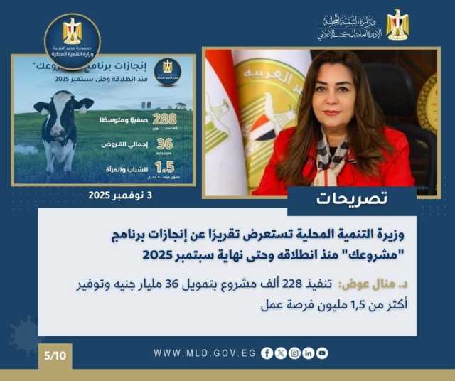تلقت الدكتورة منال عوض وزيرة التنمية المحلية، تقريرًا حول إنجازات المشروع القومي للتنمية المجتمعية والبشرية والمحلية "مشروعك" منذ انطلاقه في عام 2015 وحتى نهاية شهر سبتمبر 2025، وذلك في إطار دعم الدولة للشباب والمرأة وتمكينهم اقتصاديًا، حيث ساهم مشروعك منذ انطلاقه وحتي نهاية شهر سبتمبر الماضي في تمويل نحو 228 ألف مشروع صغير ومتوسط بمختلف محافظات الجمهورية، بإجمالي قروض حوالي 36 مليار جنيه، مما وفر 1,5 مليون فرصة عمل مباشرة وغير مباشرة للشباب والمرأة في القرى والمراكز والمدن.