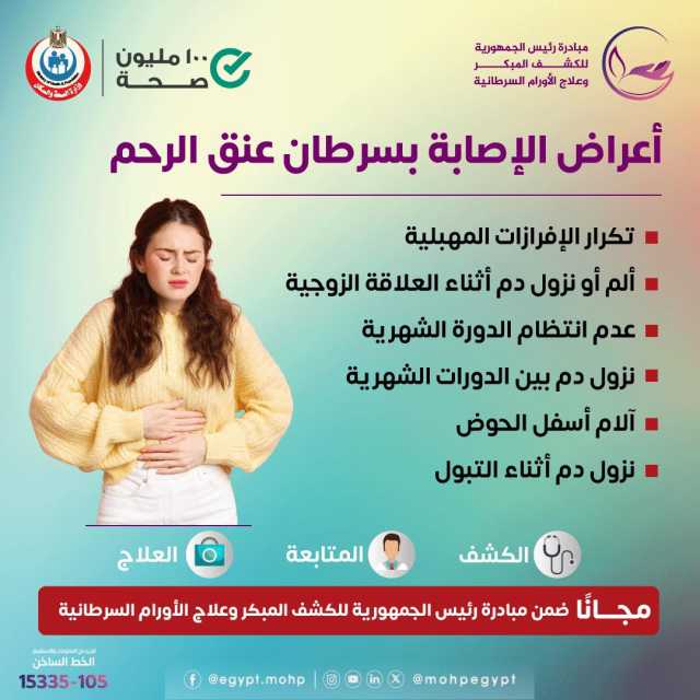 نشرت وزارة الصحة والسكان ، من خلال صفحتها الرسمية مجموعة من النصائح والمعلومات الهامة ، حول أعراض مرض سرطان عنق الرحم والأعراض الشائعة لهذا المرض.