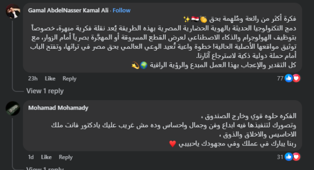 تحولت المبادرة خلال ساعات إلى تريند عالمي على مواقع التواصل الاجتماعي، بعدما تداول المستخدمون الصور المولَّدة بتقنيات الذكاء الاصطناعي، التي أظهرت تمثال نفرتيتي وحجر رشيد وعددًا من المقتنيات التاريخية داخل المتحف الكبير في مشاهد مبهرة، وعلق الآلاف والتي جاءت كالأتي، " فكرة أكثر من رائعة ومُلهِمة بحق دمج التكنولوجيا الحديثة بالهوية الحضارية المصرية بهذه الطريقة يُعد نقلة فكرية مبهرة، خصوصاً بتوظيف الهولوجرام والذكاء الاصطناعي لعرض القطع المسروقة أو المهجَّرة بصرياً أمام الزوار، مع توثيق مواقعها الأصلية الحالية خطوة واعية تُعيد الوعي العالمي بحق مصر في تراثها، وتفتح الباب أمام حملة دولية ذكية لاسترجاع آثارنا، كل التقدير والإعجاب بهذا العمل المبدع والرؤية الراقية"، وأضاف أخر :" فكرة ممتازة وتوثيق لملكية الآثار دي لمصر".