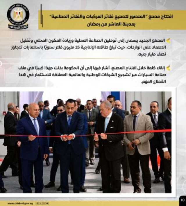 وتضمنت أنشطة رئيس الوزراء، افتتاح مصنع «المنصور لتصنيع فلاتر المركبات والفلاتر الصناعية» بمدينة العاشر من رمضان، بطاقة إنتاجية تبلغ 15 مليون فلتر سنويًا، واستثمارات تتجاوز نصف مليار جنيه، مؤكدًا ما بذلته الحكومة من جهود في ملف صناعة السيارات عبر تشجيع الشركات الوطنية والعالمية العملاقة على الاستثمار في هذا القطاع المهم.