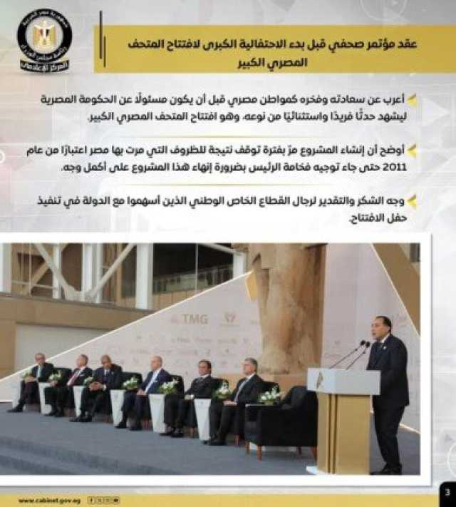وشملت الأنشطة، عقد رئيس الوزراء مؤتمر صحفي قبل بدء الاحتفالية الكبرى لافتتاح المتحف المصري الكبير، أعرب خلاله عن فخره بهذا الحدث الفريد من نوعه، موضحًا أن المشروع واجه فترة توقف منذ 2011 حتى وجه الرئيس بضرورة إنهائه على أكمل وجه، وموجهًا الشكر للقطاع الخاص الوطني لمساهمته في تنفيذ حفل الافتتاح.