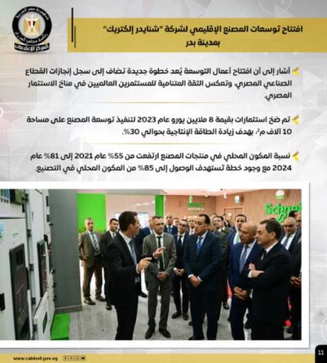كما افتتح توسعات المصنع الإقليمي لشركة «شنايدر إلكتريك» بمدينة بدر، موضحًا أن هذه الخطوة تعكس ثقة المستثمرين العالميين المتنامية في مناخ الاستثمار المصري، وتمت الإشارة إلى أنه تم ضخ استثمارات بقيمة 8 ملايين يورو عام 2023 لتنفيذ توسعة المصنع على مساحة 10 آلاف م2 لزيادة الطاقة الإنتاجية بنسبة 30%، كما ارتفعت نسبة المكون المحلي في منتجات المصنع إلى 81% عام 2024 مع خطة للوصول إلى 85%.