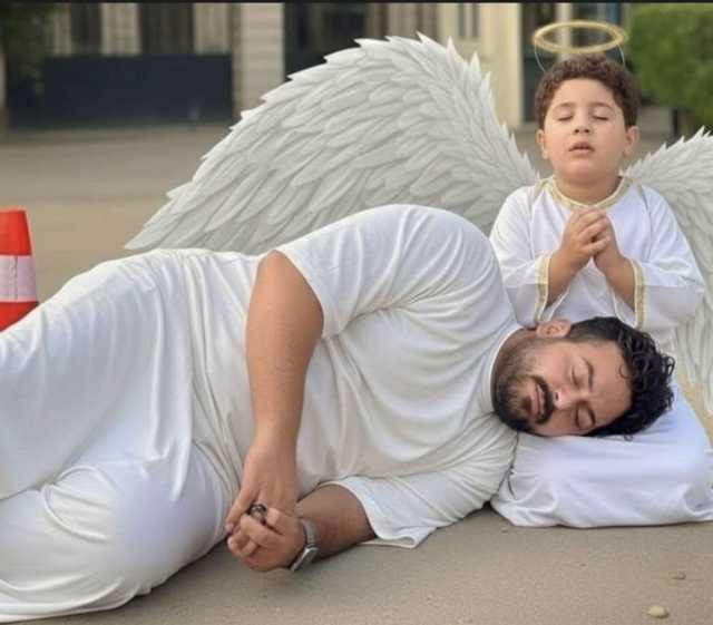 نشر حمو بيكا صورة مصممة بالذكاء الإصطناعي تجمع إسماعيل الليثي بابنه الراحل ضاضا وهو يطهر في صورة ملاك ويدعو لوالده.