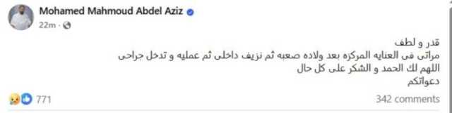وطلب محمد محمود عبد العزيز، عبر حسابه الرسمي بموقع التواصل الاجتماعي «فيسبوك»، الدعاء لزوجته، قائلا: «قدر ولطف، مراتي في العناية المركزة بعد ولادة صعبة ثم نزيف داخلي ثم عملية وتدخل جراحي، اللهم لك الحمد والشكر على كل حال، دعواتكم».