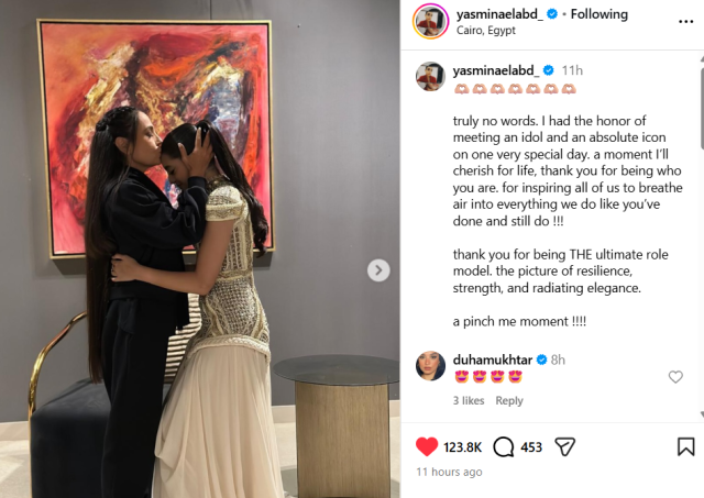 نشرت ياسمينا العبد صورة شريهان وهي تقبل رأسها على هامش مشاركتهما في حفل افتتاح المتحف المصري الكبير، ووصفت تلك اللقطة بأنها بمثابة “لحظة لا تصدق وستظل تعتز بها مدى الحياة"، حيث علقت على الصور قائلة: “حقًا لا أجد كلمات تعبر عن شعوري، كان لي الشرف أن ألتقي بأحد أيقوناتي الملهمين في يوم مميز جدا”.