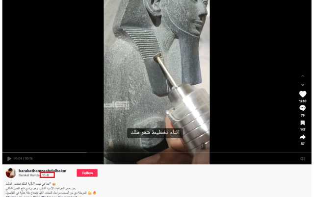 وحينها كتب بركات تعليقًا على الفيديو: "من حجر الجرانيت الأسود النادر، وهو يرتدي تاج النِمس الملكي. المرحلة دي من أصعب مراحل النحت، لأنها بتحتاج دقة عالية في التفاصيل".