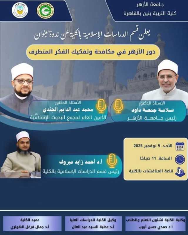 في إطار الدور التنويري والوطني الذي يضطلع به الأزهر الشريف في مواجهة الفكر المنحرف، تستضيف كلية التربية بنين بالقاهرة – جامعة الأزهر ندوة علمية كبرى بعنوان "دور الأزهر في مكافحة وتفكيك الفكر المتطرف"، وذلك يوم الأحد الموافق 9 نوفمبر 2025م، في تمام الساعة الحادية عشرة صباحًا، بقاعة المناقشات الكبرى بالكلية.