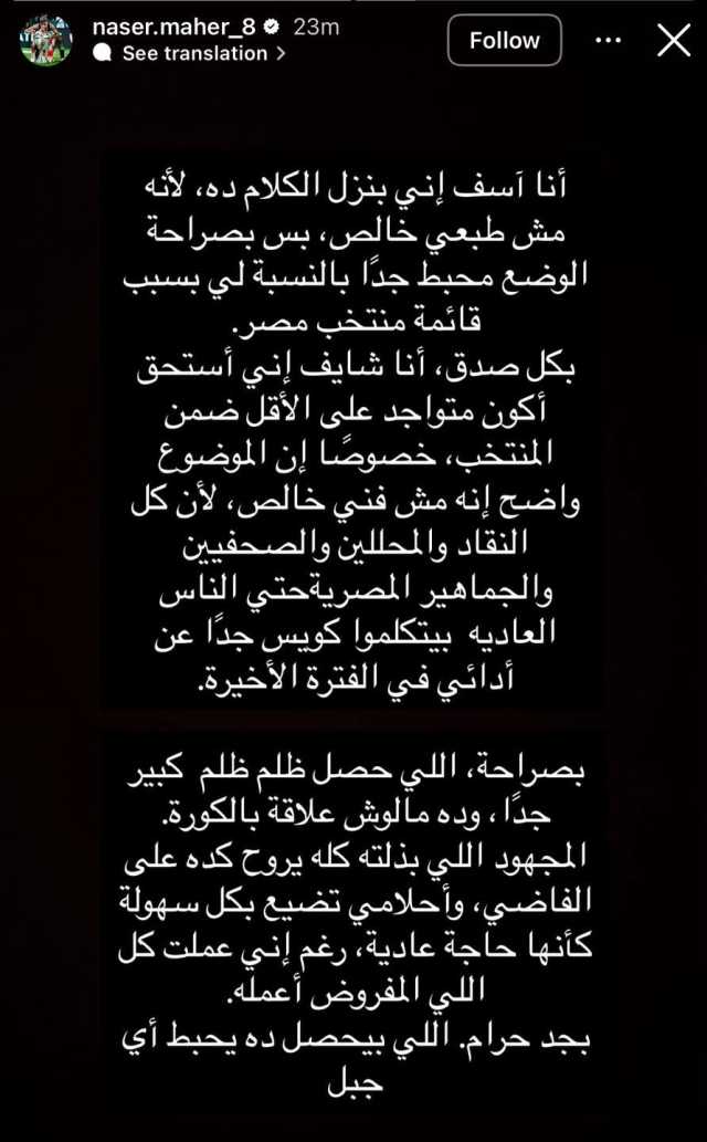 وكتب ناصر ماهر عبر انستجرام: “أنا أسف اني بنزل الكلام ده، لأنه مش طبعي خالص بس الصراحة الوضع محبط جدا بالنسبة لي بسبب قائمة منتخب مصر”.