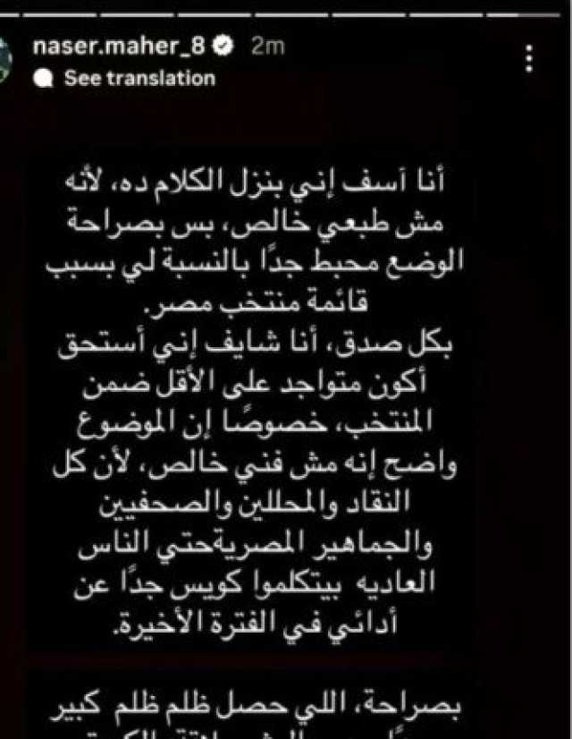 وقال ناصر ماهر عبر صفحته الرسمية على موقع التواصل الاجتماعي «إنستجرام»: «أنا آسف إني بنزل الكلام ده، لأنه مش طبعي خالص، لكن بصراحة الوضع محبط جدًا بالنسبة لي بسبب قائمة منتخب مصر».