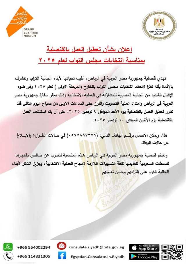 قنصلية مصر بالرياض تعطل العمل غدًا بسبب الإقبال على التصويت بانتخابات النواب