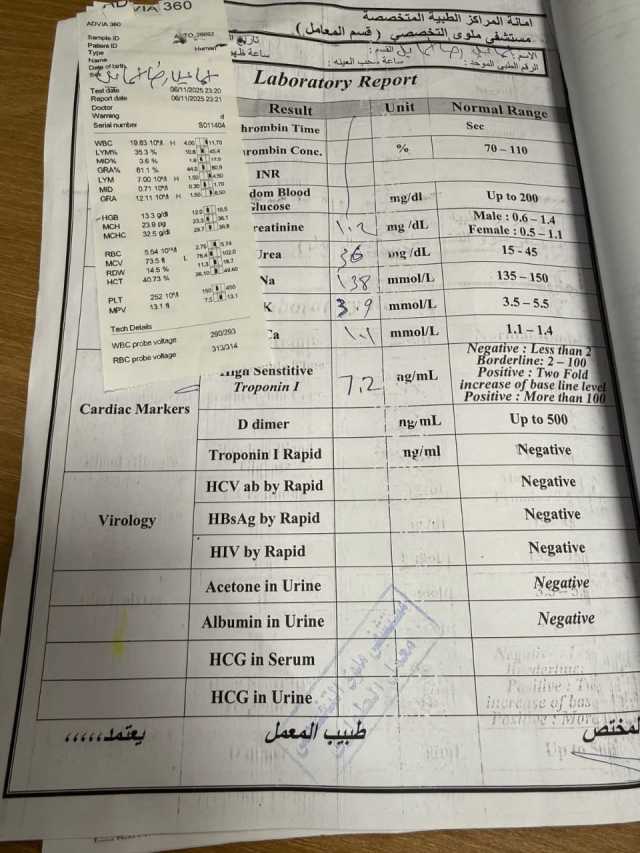 كما كشفت نتائج التحاليل المعملية ارتفاع إنزيم القلب Troponin I إلى 7.2، ما يشير إلى تأثر عضلة القلب نتيجة الصدمة، بينما جاءت باقي التحاليل الخاصة بوظائف الكُلى والكبد في المعدلات المقبولة، مع استقرار نسبي في نسبة الصوديوم والبوتاسيوم بالدم