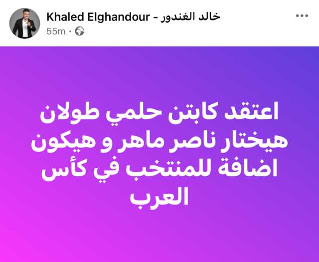 وكتب الغندور عبر حسابه الشخصي على موقع التواصل الاجتماعي فيسبوك: “أعتقد كابتن حلمي طولان هيختار ناصر ماهر، وهيكون إضافة للمنتخب في كأس العرب".