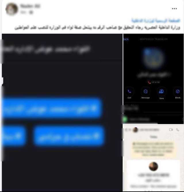 كشفت الأجهزة الأمنية ملابسات منشور مدعوم بصور تم تداوله بمواقع التواصل الإجتماعى تضمن الزعم بقيام شخصين بالنصب والإحتيال على المواطنين راغبى التبرع للحالات المرضية والإنسانية بأسلوب "إنتحال الصفة" من خلال أحد برامج الهواتف الذكية.