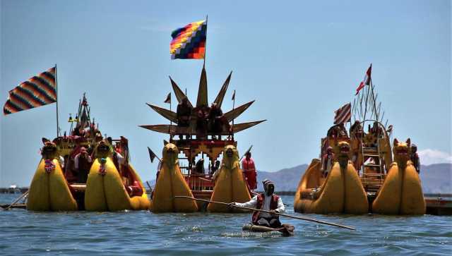 على ضفاف البحيرة، تظهر قوارب “التوتورا” التقليدية المصنوعة من القصب، محمولة على رغوة الأمواج. على متنها، يظهر ممثلو العرض بأزياء متقنة وبراقة تحتبس لها الأنفاس: “مانكو كاباك” بمظهره الملكي حاملا العصا الذهبية، و”ماما أوكلو” بجمالها ورصانتها، و”إنتي” إله الشمس بمظهره الساطع والمتلألئ.